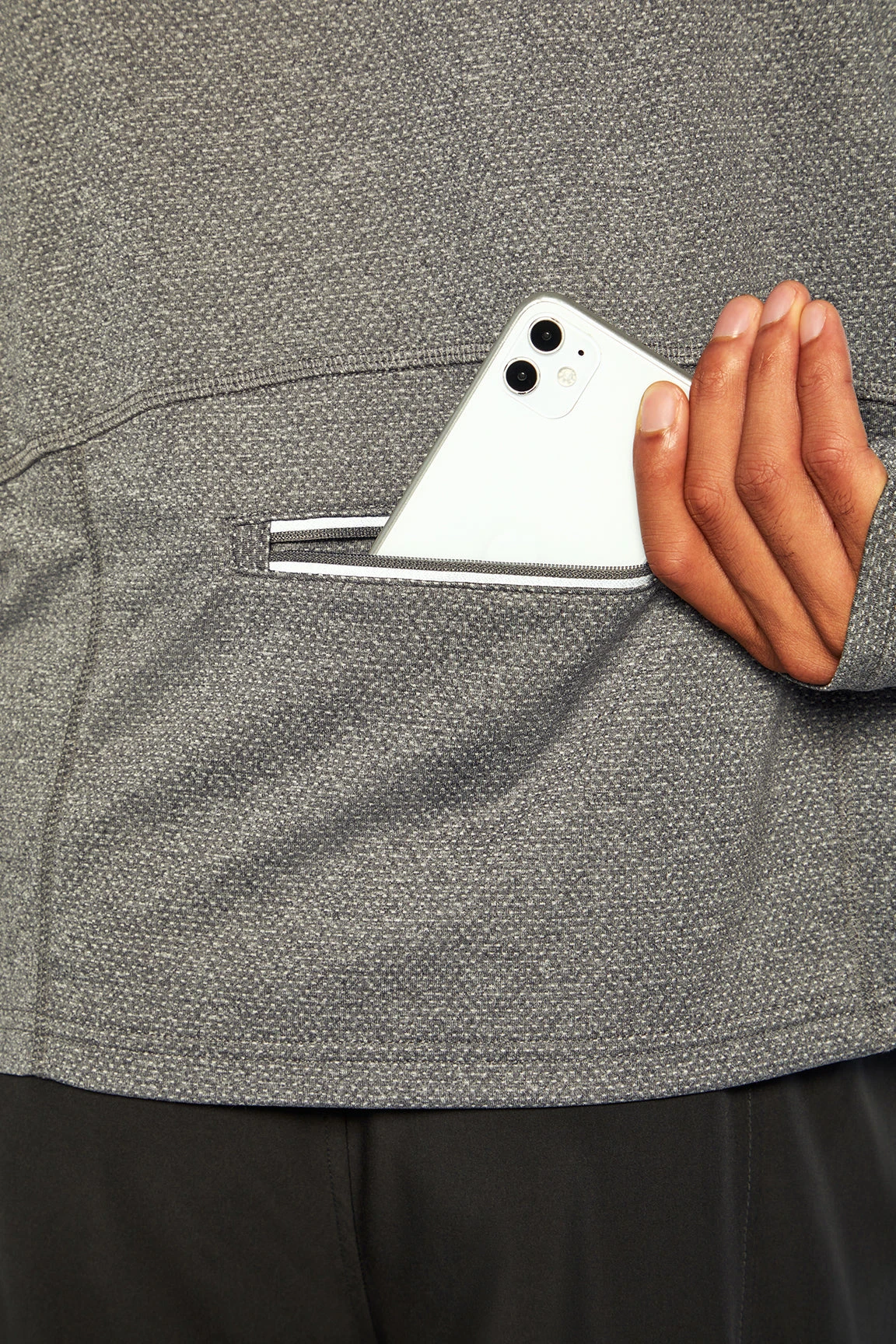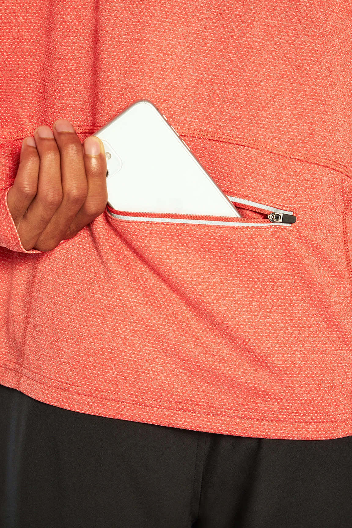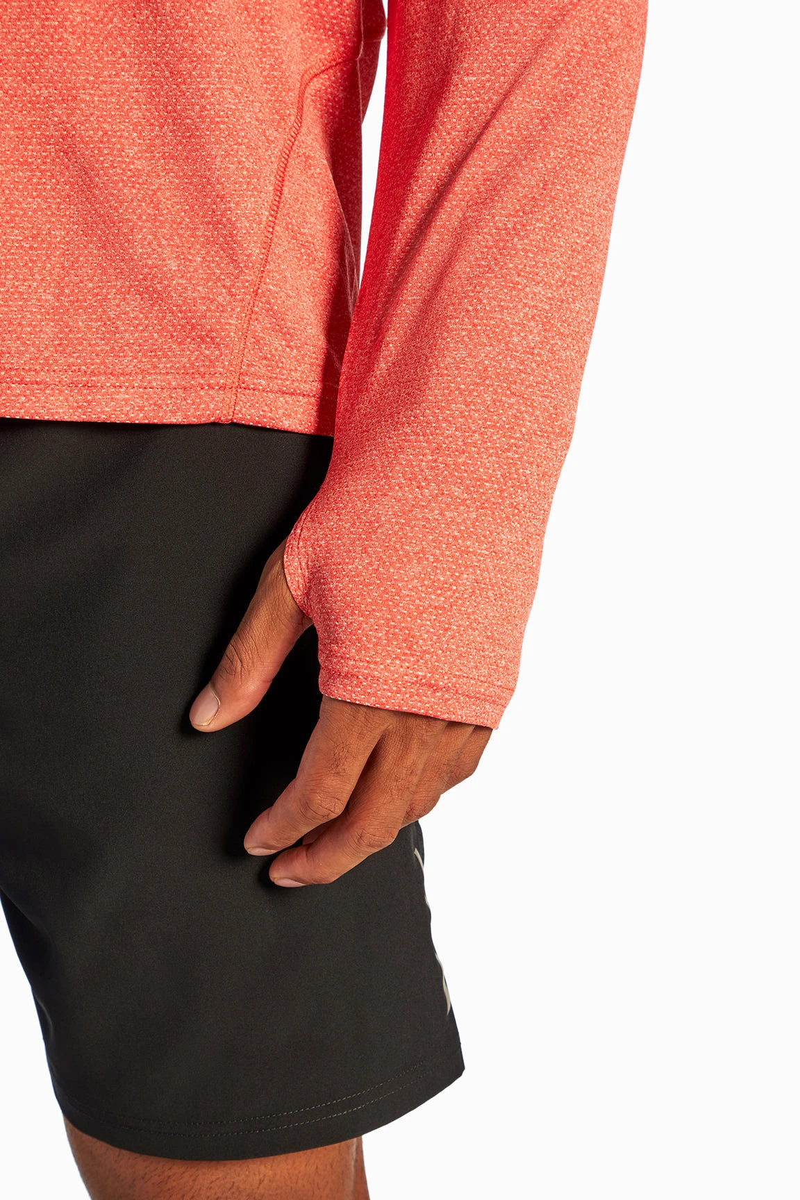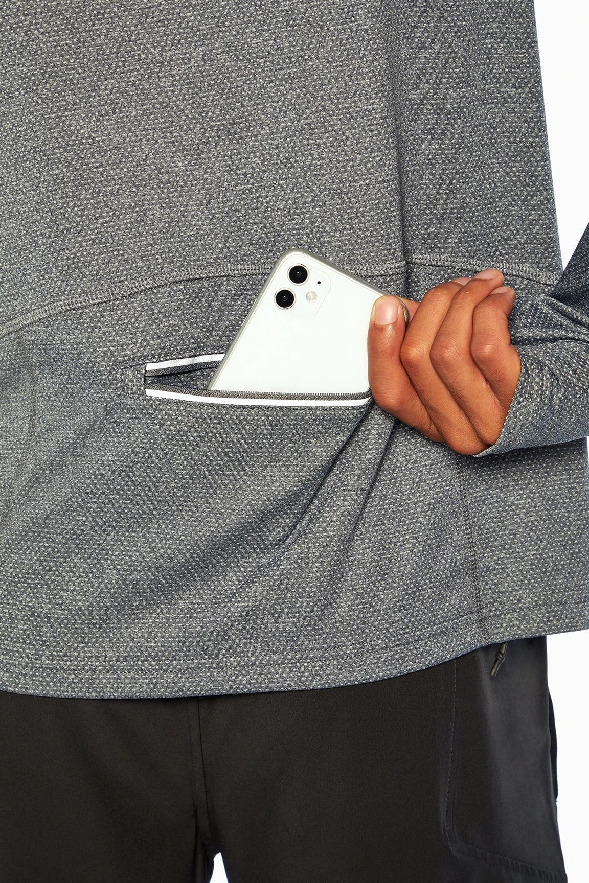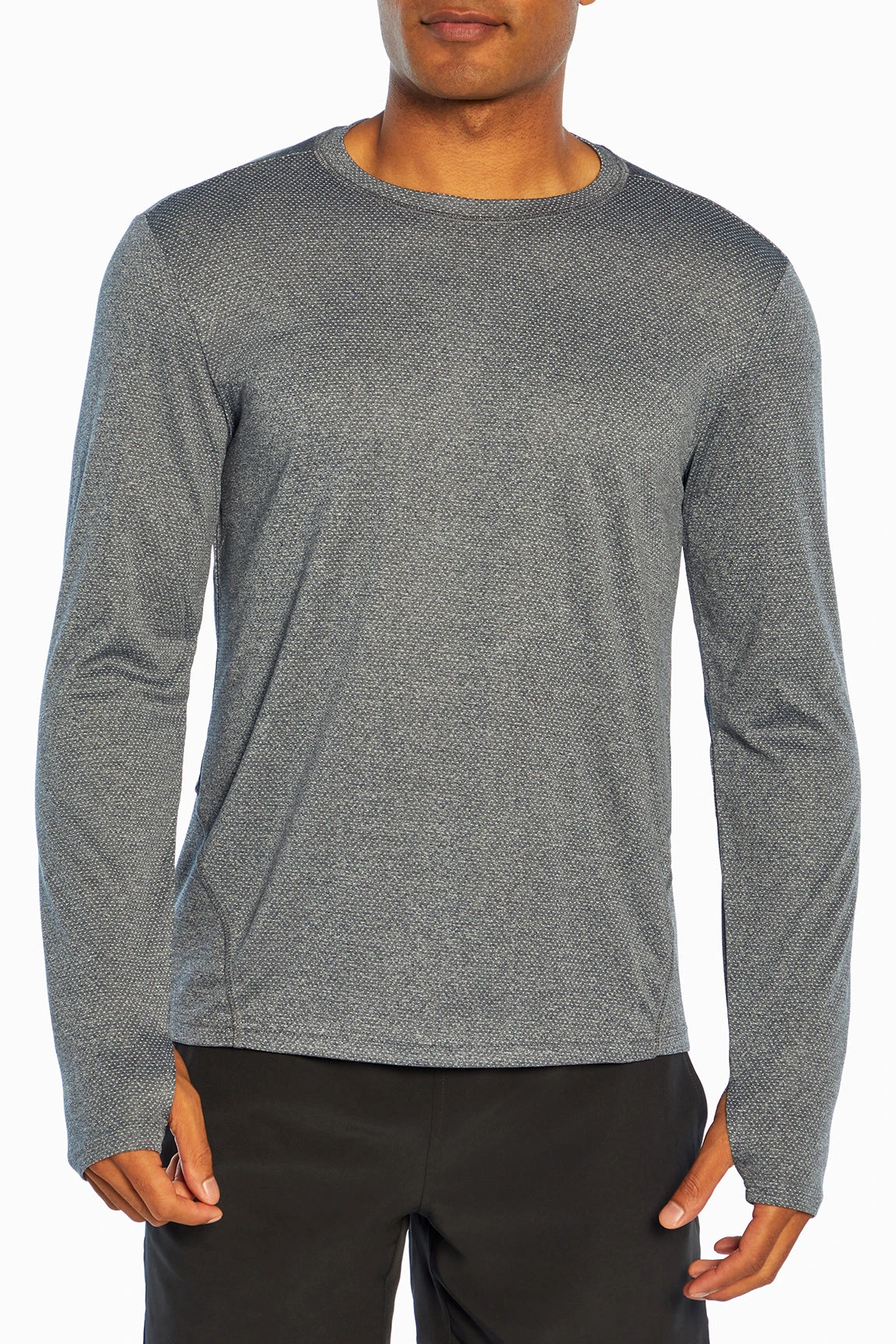 Ready for performance, this long sleeve top features thumbholes and a unique, convenient back bottom zipper pocket.