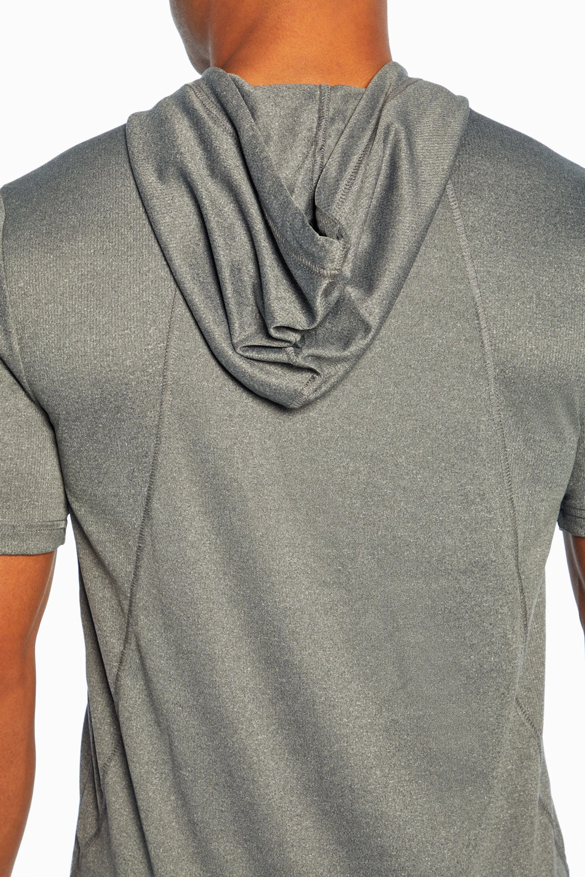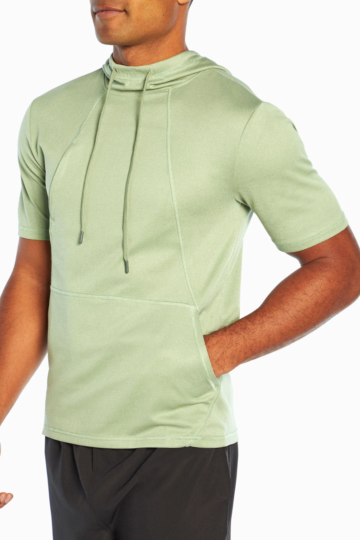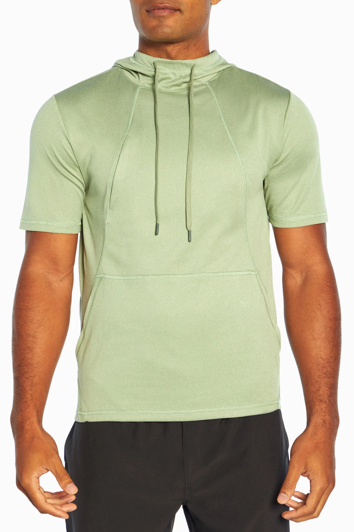 Made with a comfortable fit, this short-sleeve hoodie features a hidden zipper pocket at the front side of the chest, drawcords, contrast inset at the side and back, and front kangaroo pocket.