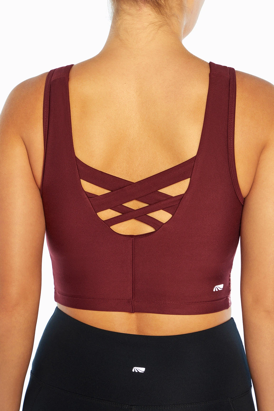 Soft inside and out and made for mid-impact workouts, this longline sports bra features a V-neck and back with crisscross strappy design, foil design, and moisture-wicking fabric.