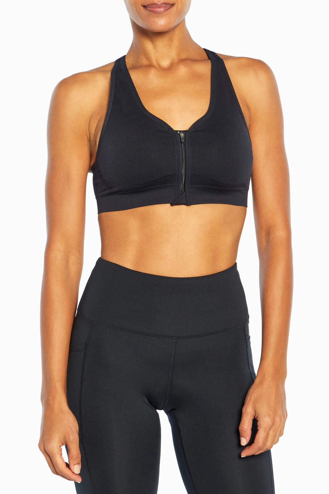 The convenient zip-front closure on this low-impact, seamless sports bra offers you comfort and functionality for your fitness plans — the adjustable straps, racerback, and back keyhole detail are bonus features.