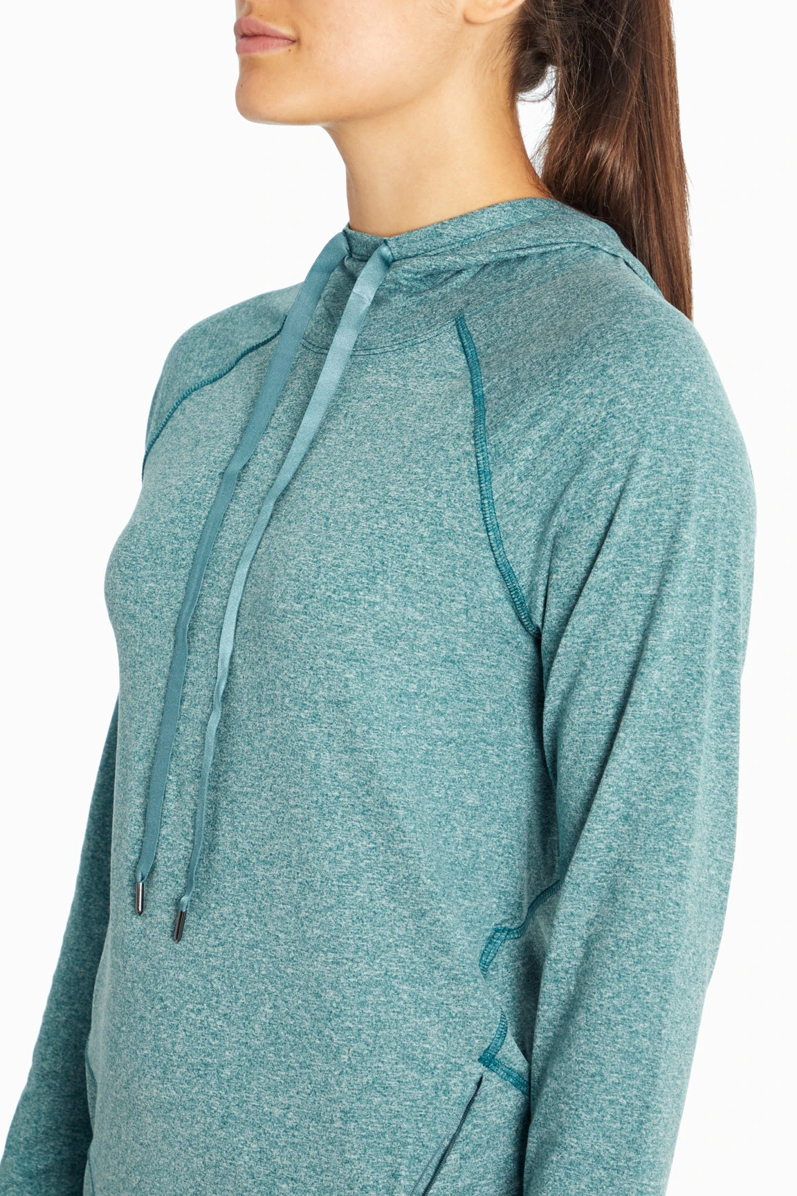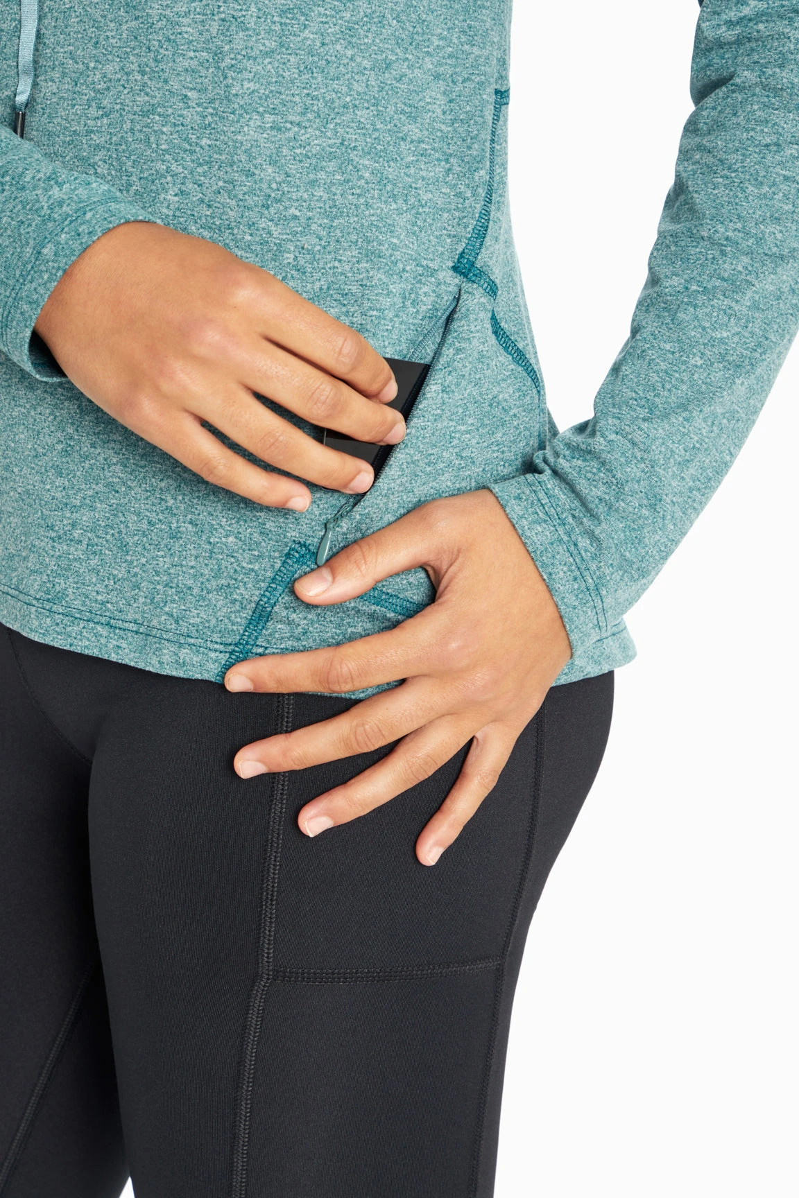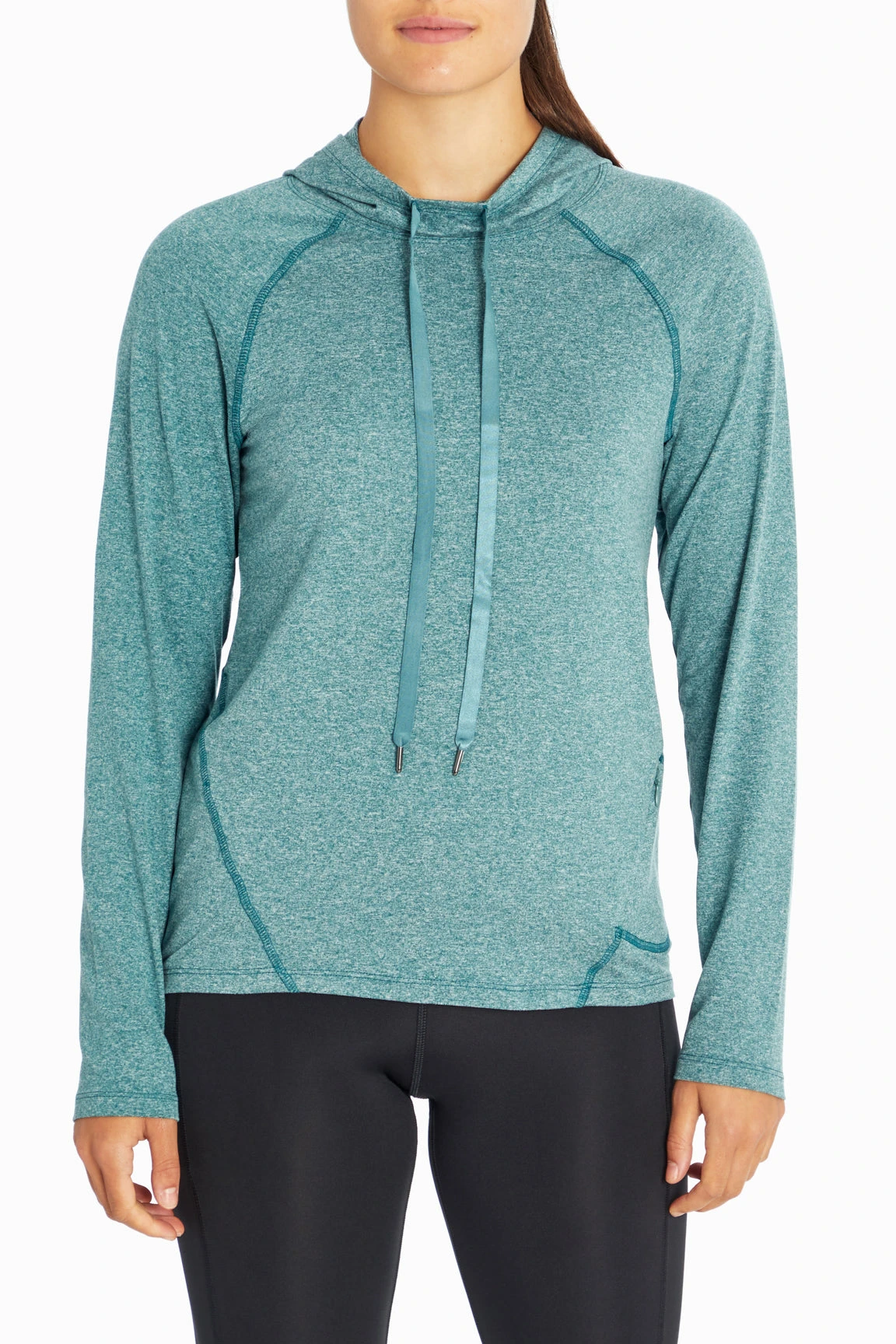 Feeling comfortable is a priority getting your daily steps in — this hood will take you there with its drawstring hood with funnel neck, moisture-combatting fabric, long raglan sleeves with thumbholes, and single invisible zipper pocket at one side.