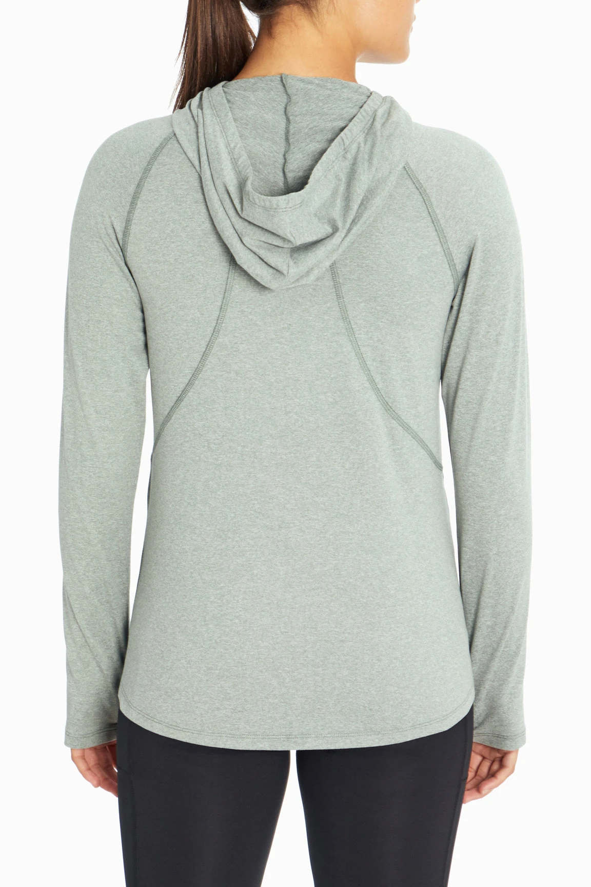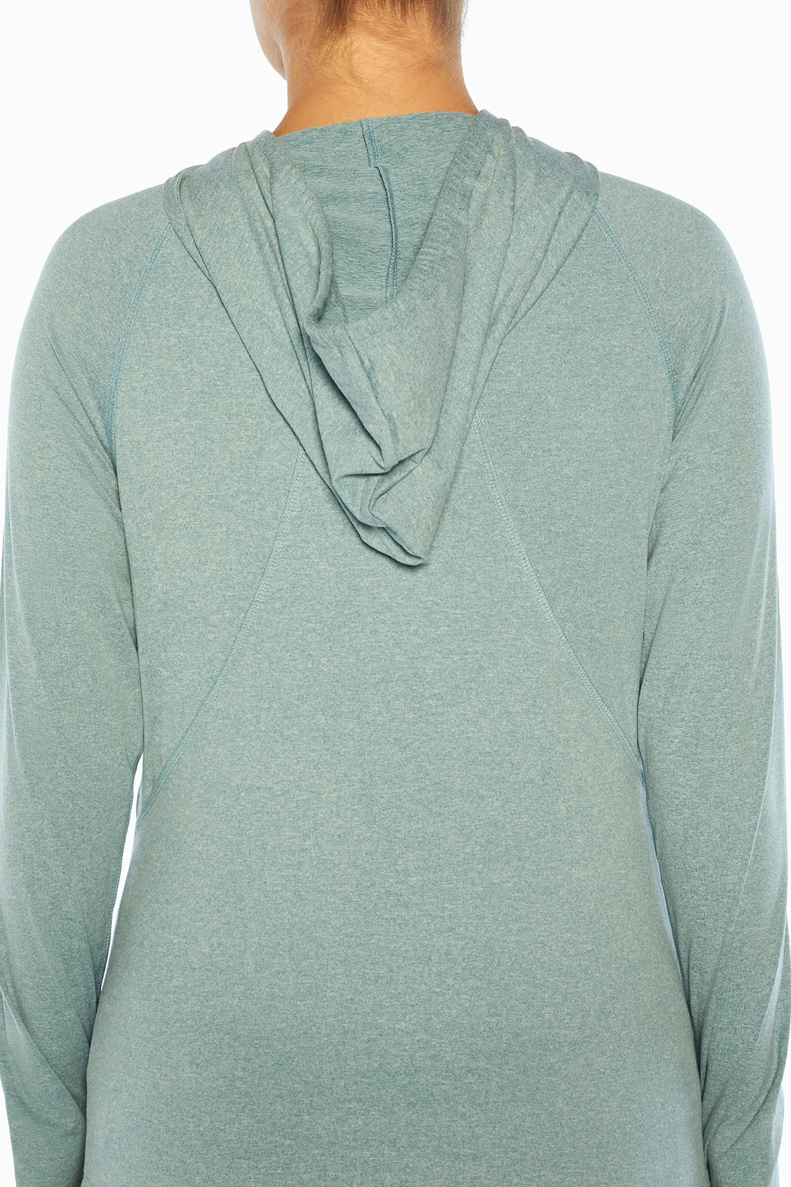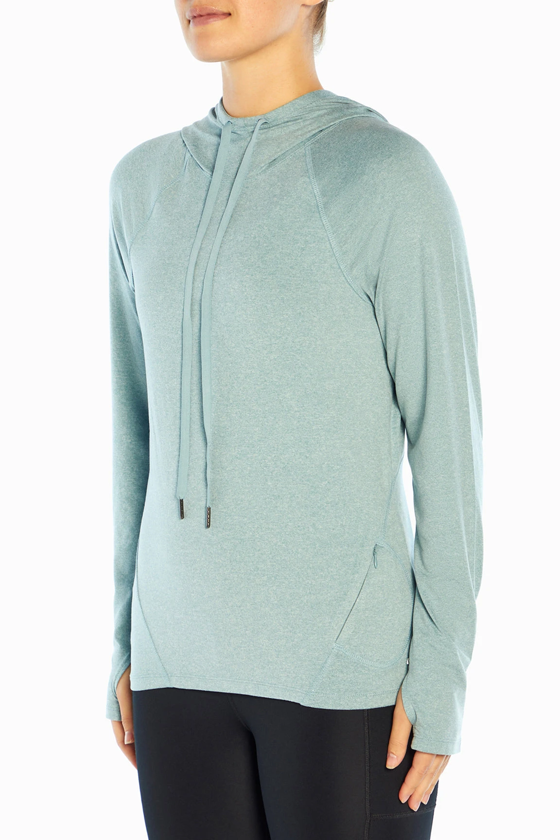 Feeling comfortable is a priority getting your daily steps in — this hood will take you there with its drawstring hood with funnel neck, moisture-combatting fabric, long raglan sleeves with thumbholes, and single invisible zipper pocket at one side.