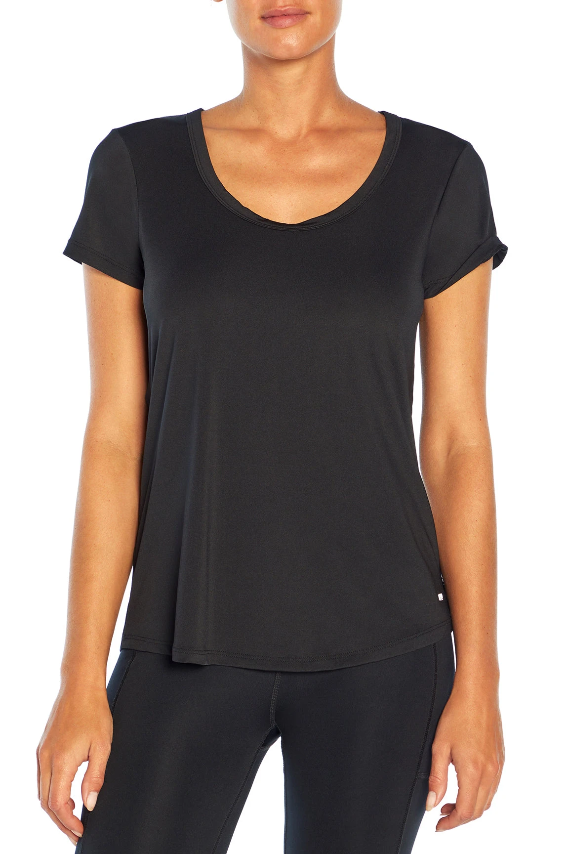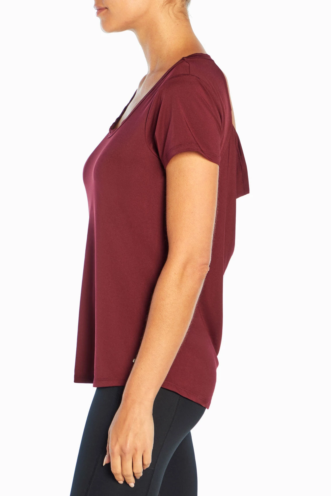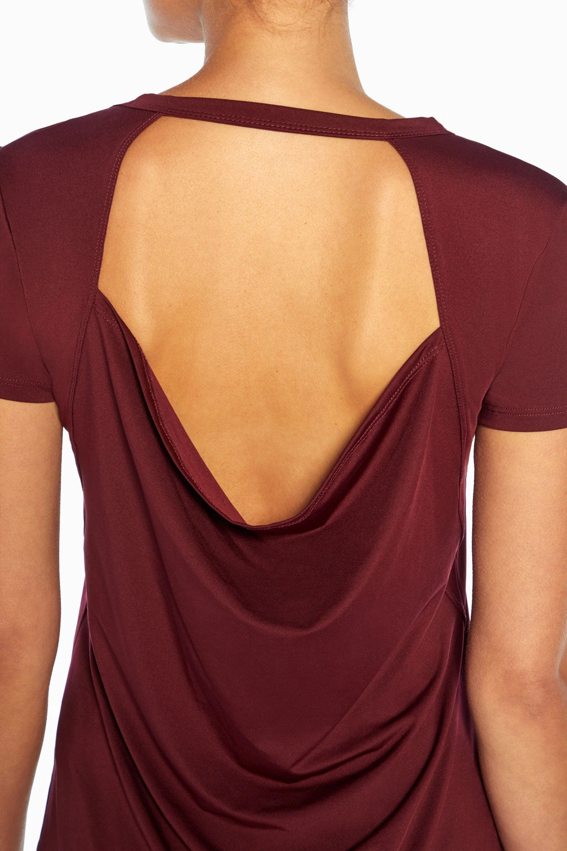 Made from a recycled material, this tee has an open drape back with cowl design and scoop neck.